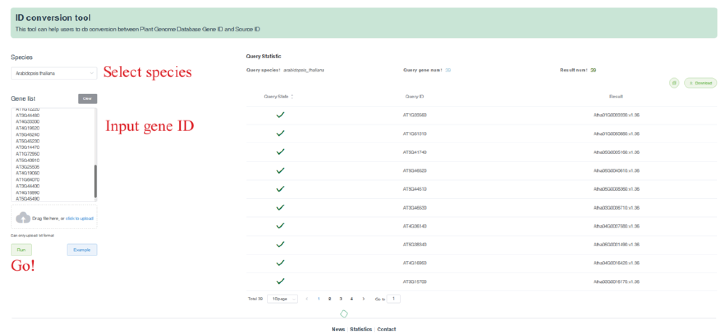 This tool is designed to facilitate the translation between source ID and Plant Genome Database Gene ID. The user can select the species name, then enters the gene ID and clicks run to get its ID in the PGdatabase. NOTE: Each line has one Gene ID, separated by CRLF.