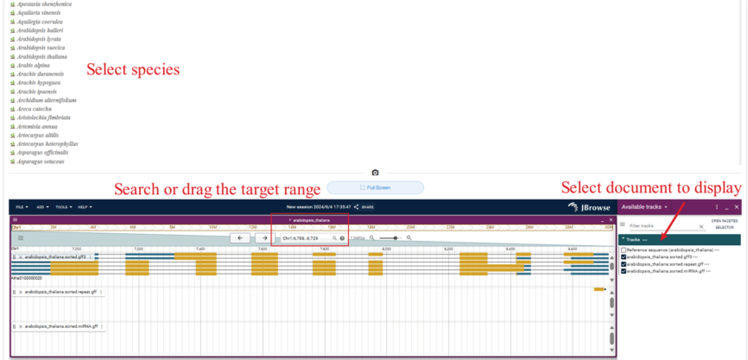 This module provides a genome browser for each species in PGdatabase, where users can interactively browse genetic information including gene sequences, intron and exon arrangements, etc. This tool provides two Genome Browsers (Jbrowse2 and WashU Browser) for users to explore genomic data.