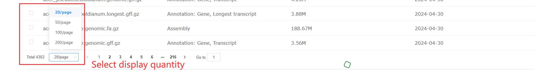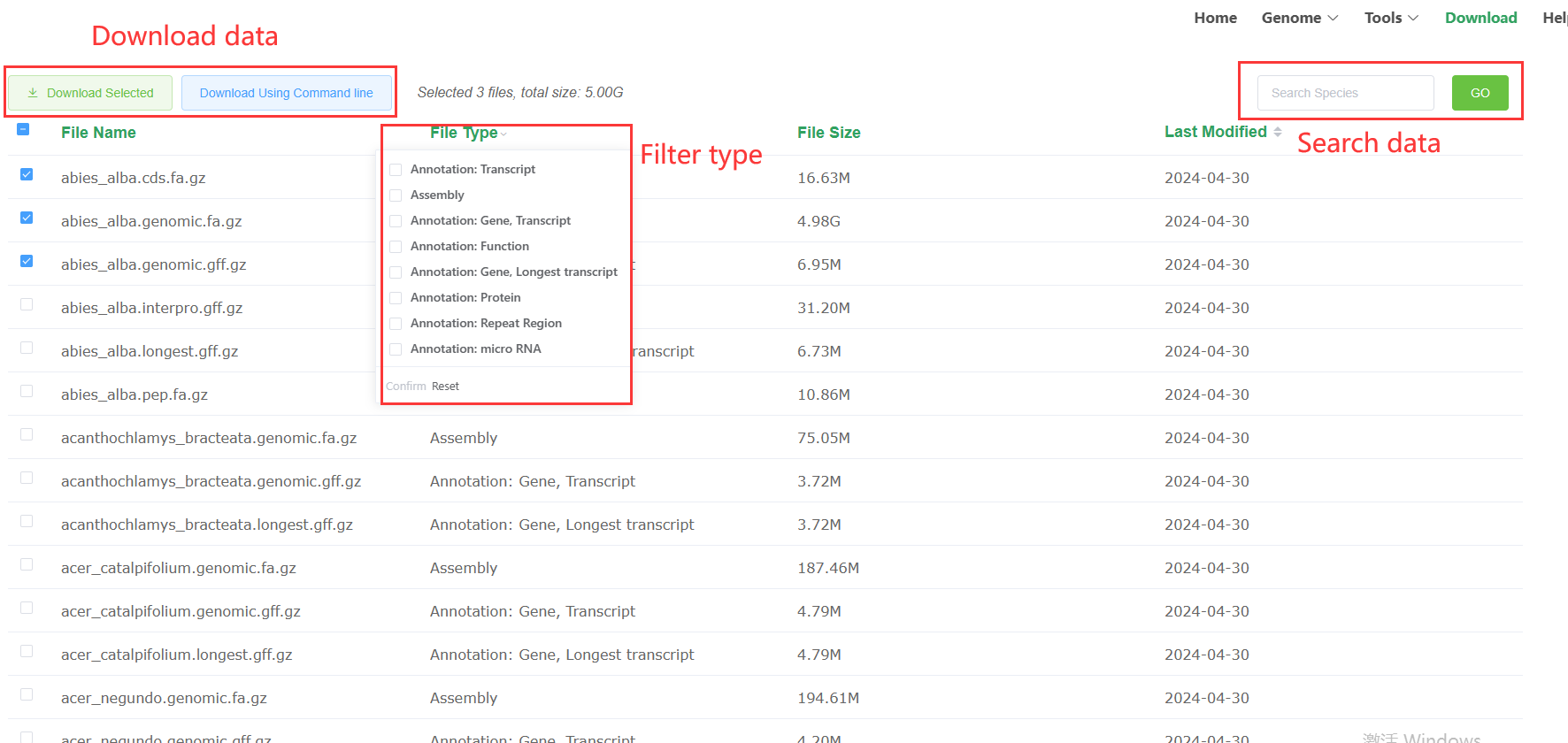 Here, PGCP provides a download module where you can download the genomes of species and their annotation files from any PGCP database. You can choose to download directly or with the command line, but please note that you can download up to 20 files at a time at the same time. In addition, you can filter the files by filtering the file type to find the file you need or by searching the search box for the field you need to find.