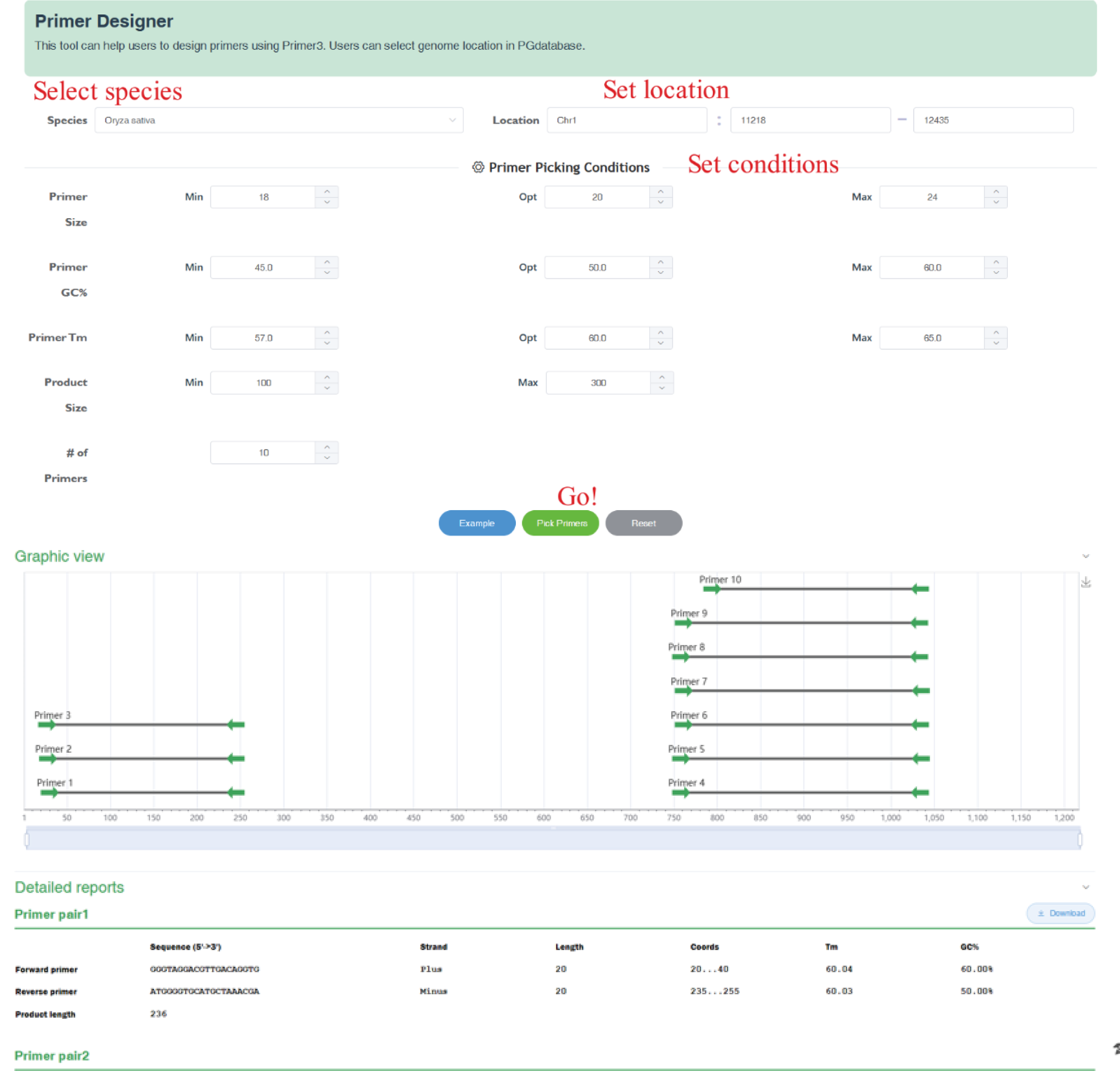 The Primer Design tool integrates with Primer3 to assist users in designing PCR primers based on the genomic sequences available in PGdatabase. After choosing a species and genomic region and setting parameters such as product length and Tm, users can obtain their primer sequences for lab work.