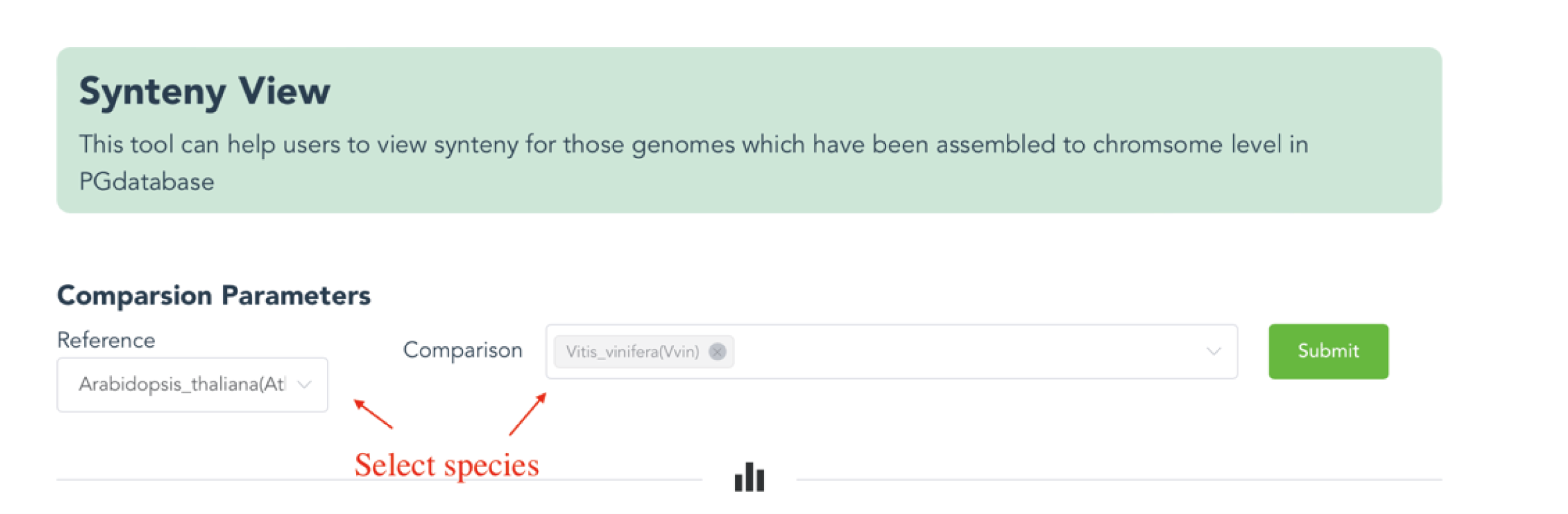 The Synteny View tool offers an intuitive collinear blocks information by embedded MCScanX software. Furthermore, users have multiple options for visualizing collinearity, like Linear Parallel plots, Hive plots, Stacked Parallel Plots and Dot plots. It is easy for users find out some conservative blocks and important functional genes between various species genomes on our database. Here are some personalized choices for visualizing collinearity.