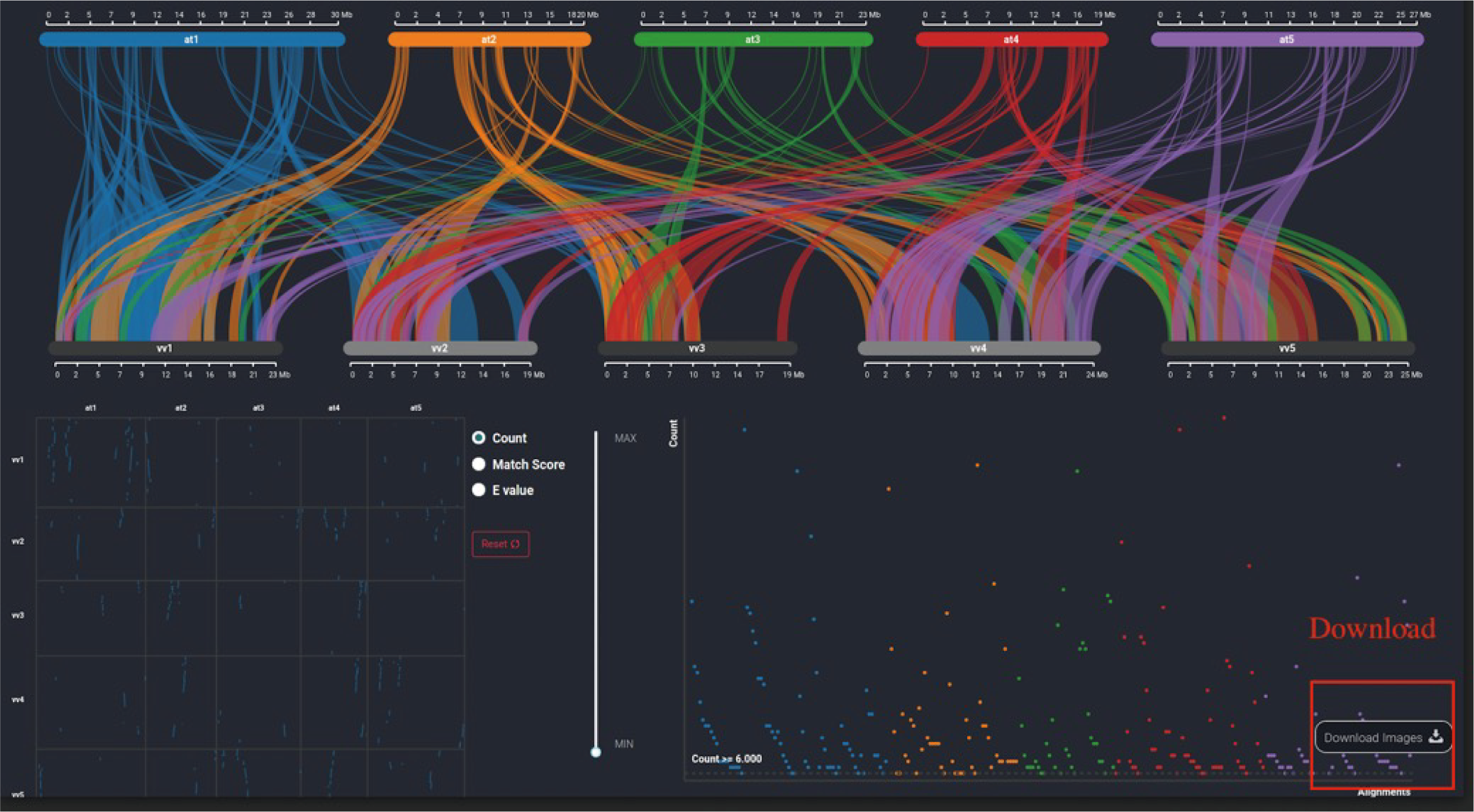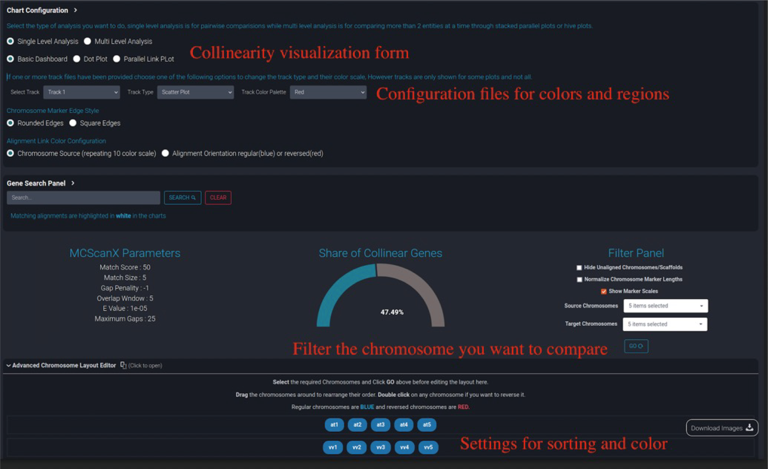 - Visual selection. We support display whole genome collinearity or specific chromosomes depend on users. Optional track file in bedgraph format to annotate the generated charts. Users also can choose to download the generated figures in publication ready SVG or PNG formats.