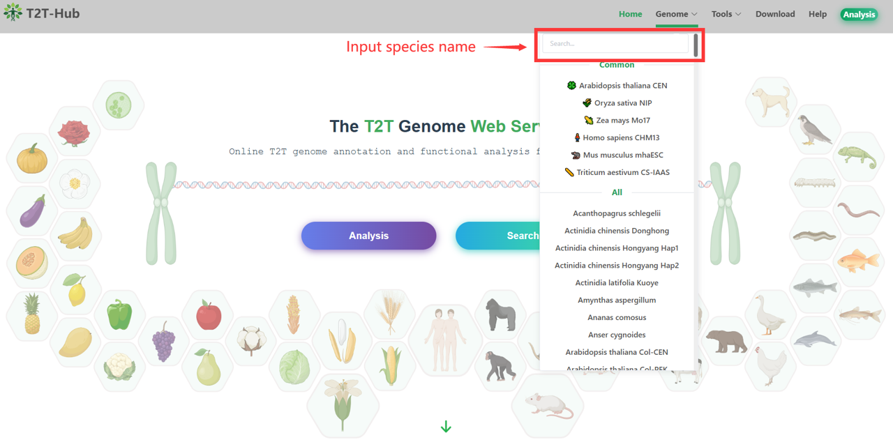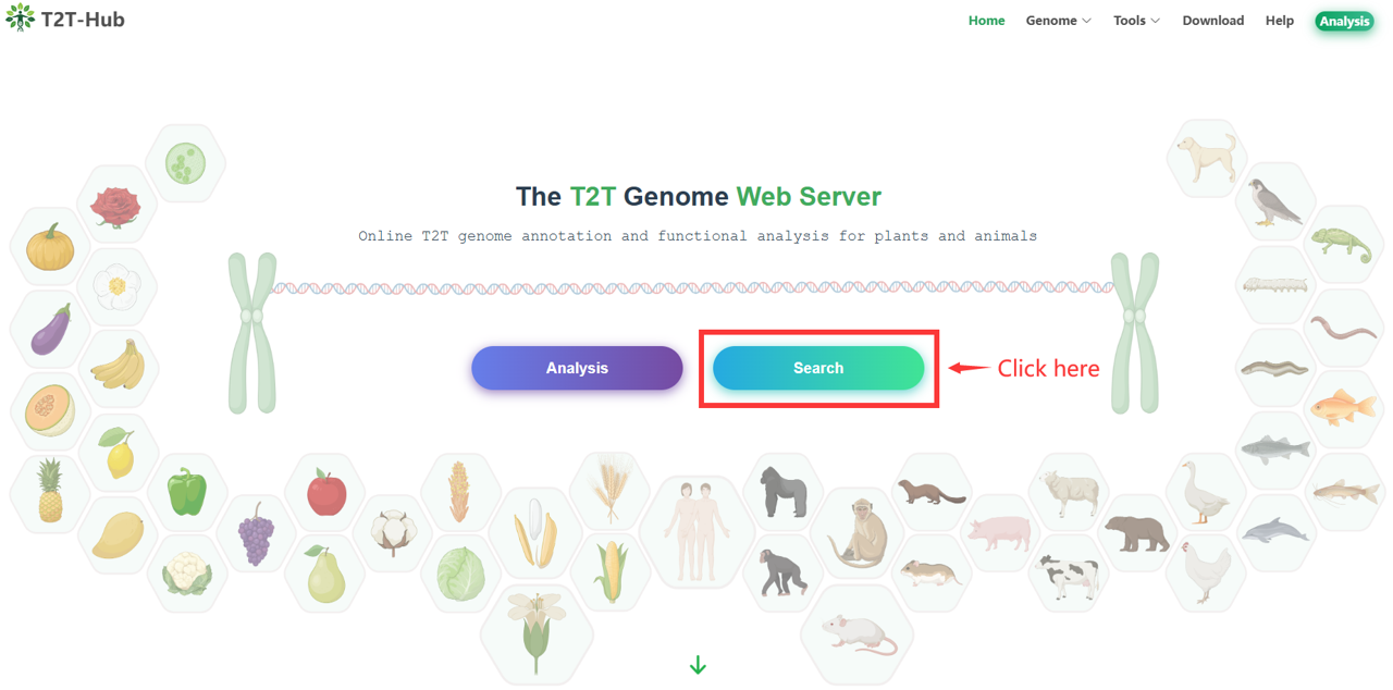 PlanT2T provides a genome search function for users to search for the genome of interest. Then users can click the Genome name to view the genome page.