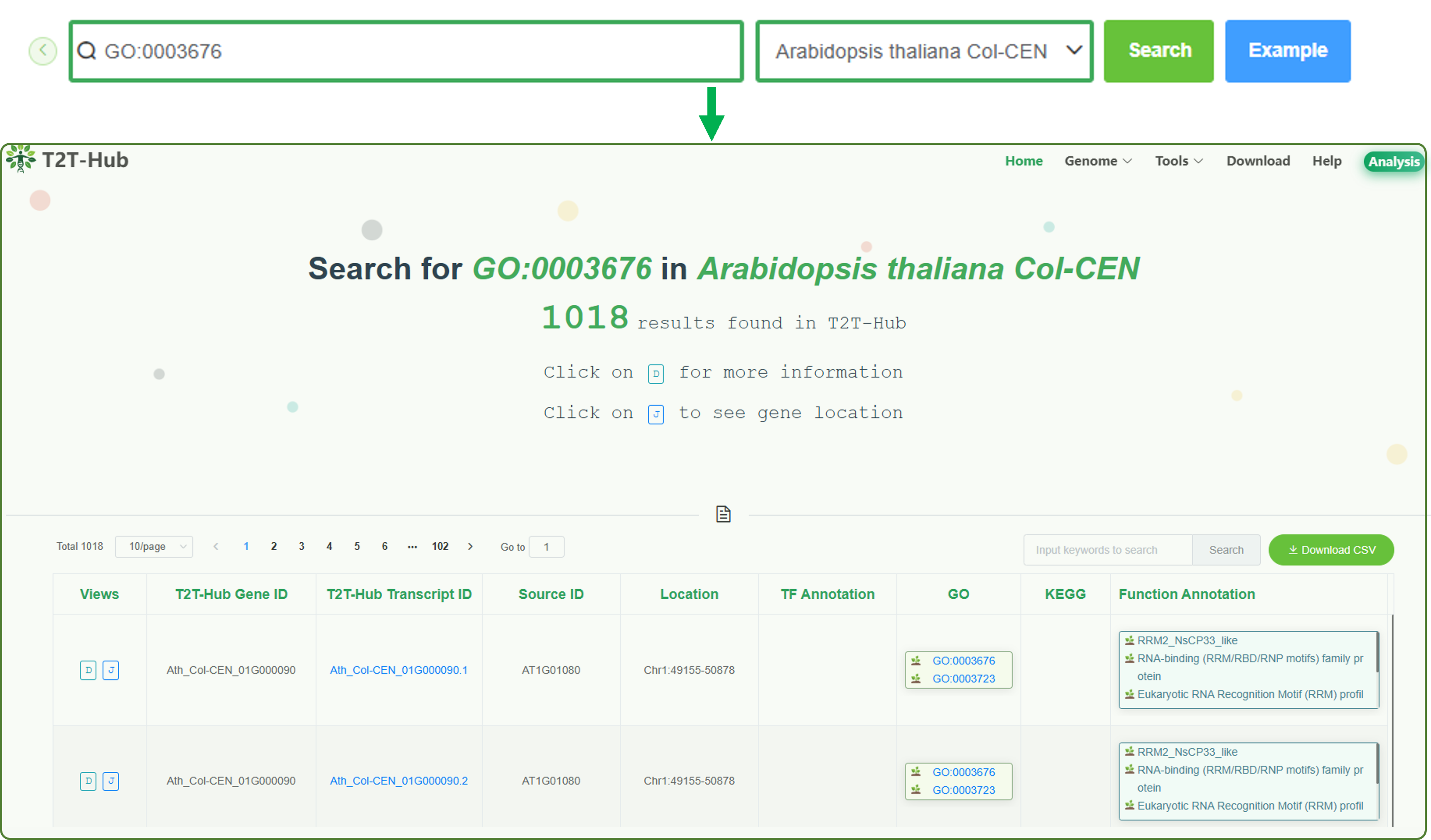 source gene IDorPlanT2T IDthey are looking for in the search box. The search box supports bothexact matchandfuzzy matchsearch. The search box will automatically prompt the user with the matching results as the user types in the search box.Finally click Search button