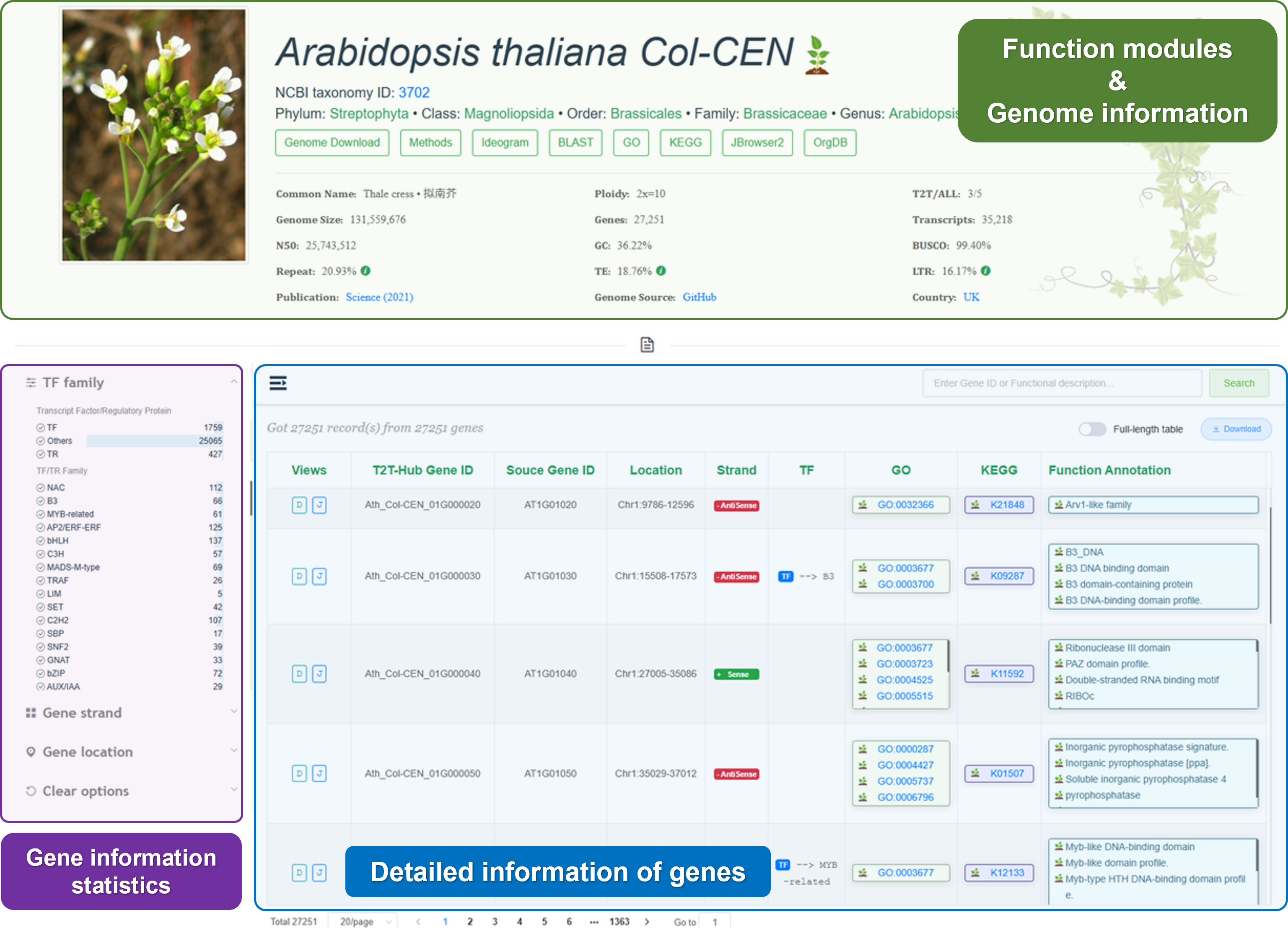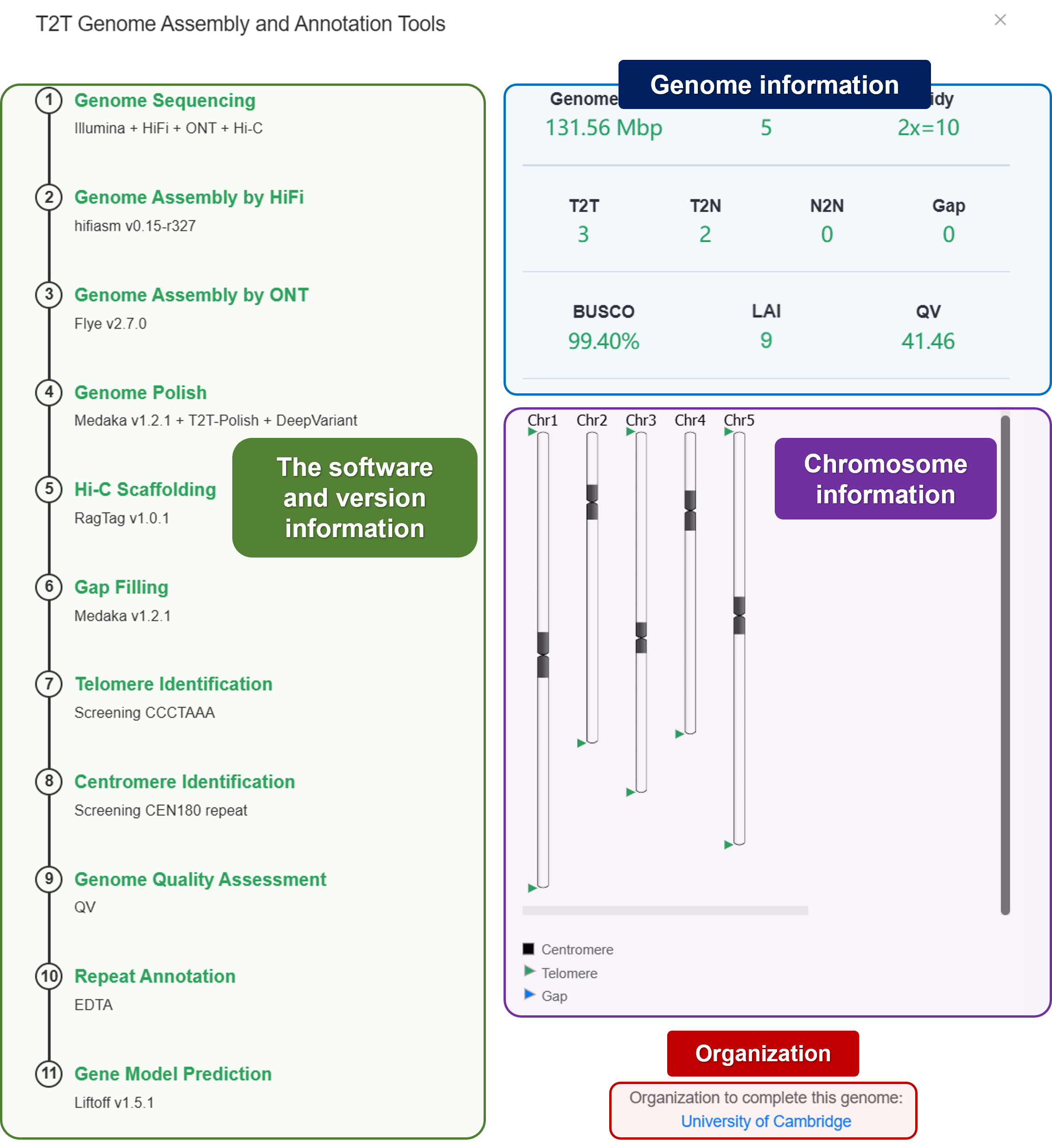 In this part, T2T-Hub provides meta information for each species. You can view genome information, detailed information, and gene table.