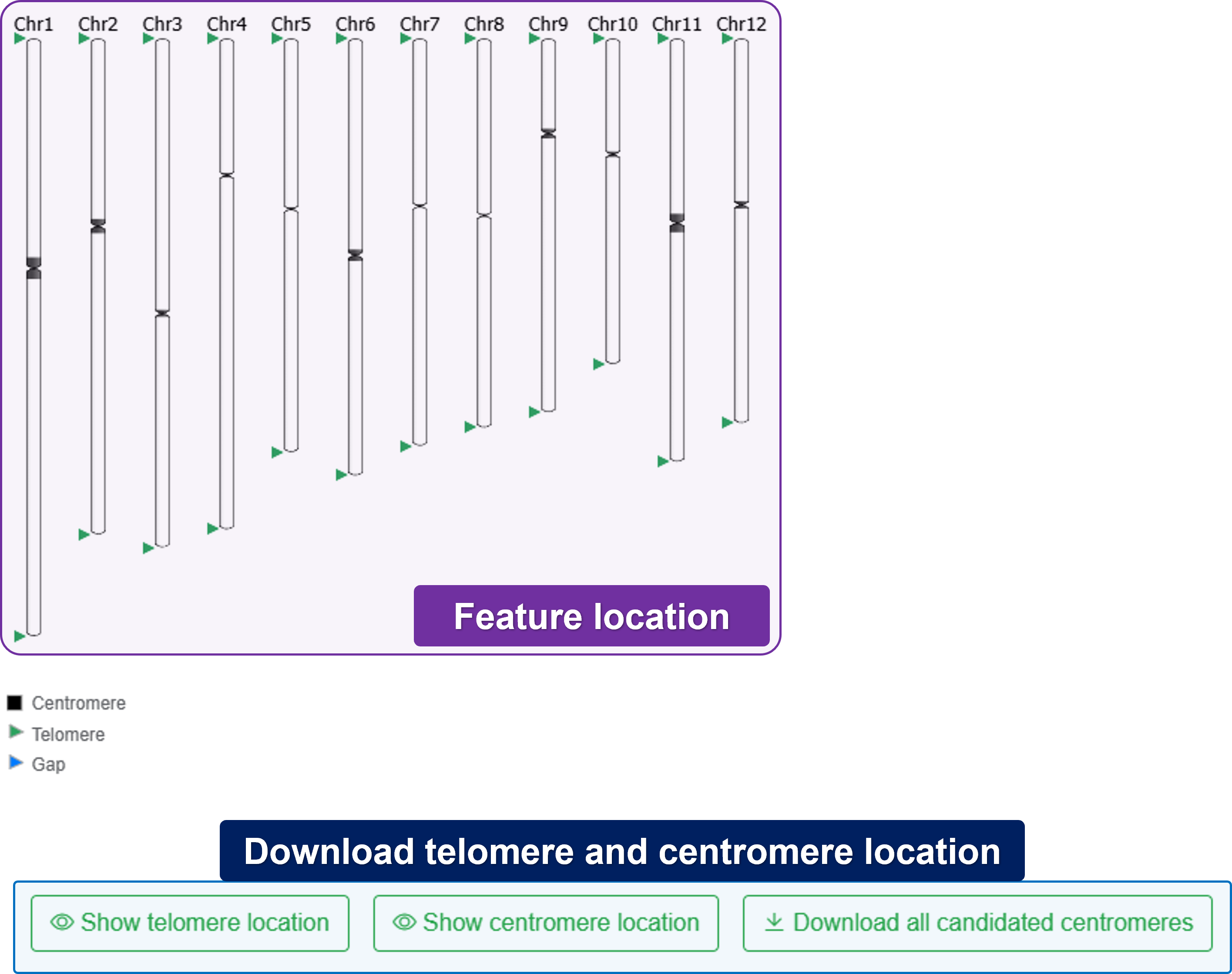- Ideogram: Visualize the features location (Telomere, Centromere, and Gap).