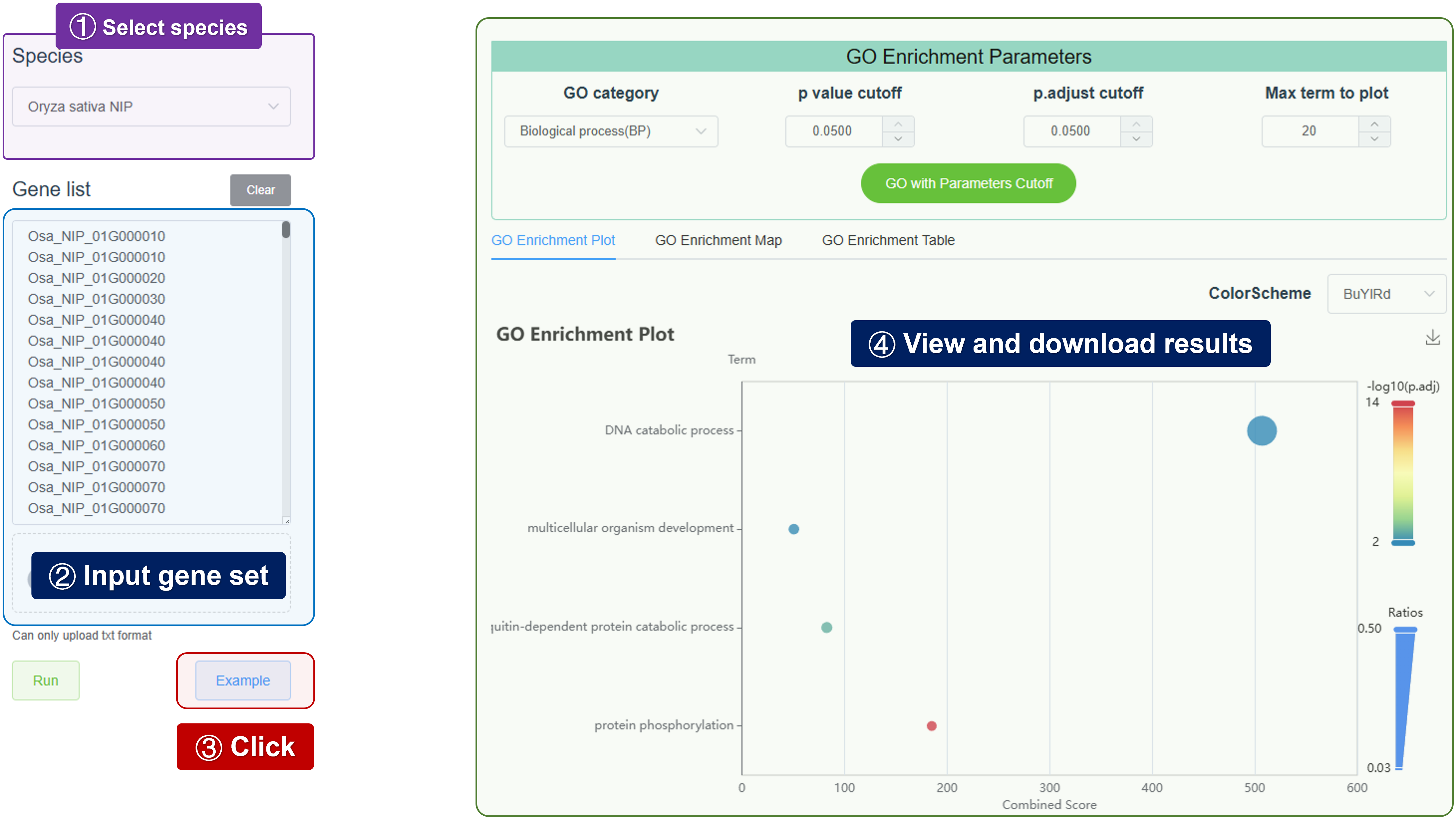 - GO: Perform Gene Ontology (GO) enrichment analysis to identify overrepresented GO terms in a set of genes.