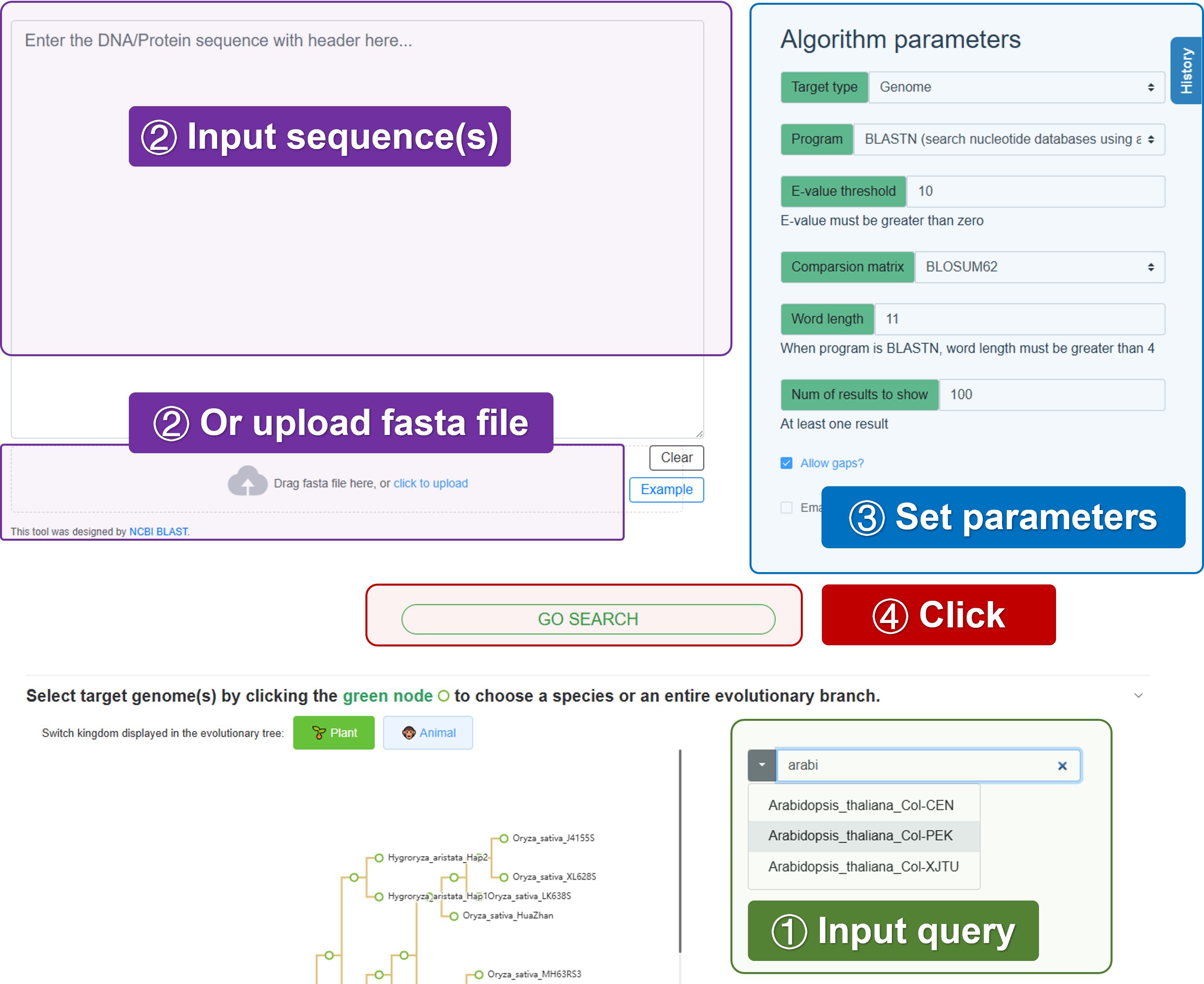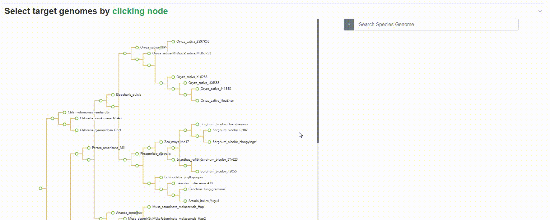 Except for searching for species genomes one by one, users can also click on the left evolutionary tree to batch select the species to be compared, which is very useful for quickly retrieving all species of a genus or family.
