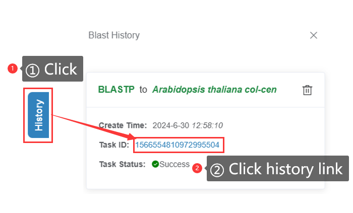 The BLAST history function records the BLAST analysis results of the user. Users can view the BLAST analysis results by clicking on the corresponding analysis record.