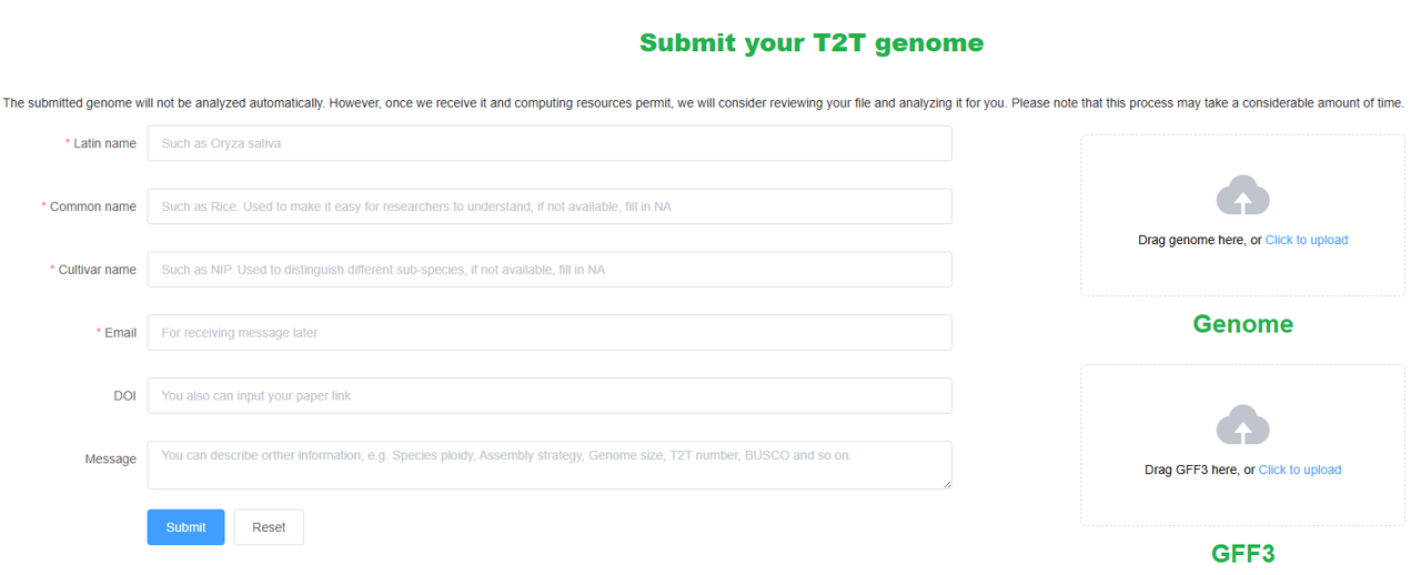Similar to the Genome Analysis module, users also can submit their genome and annotation data to the T2T-Hub platform. However, the submitted genome will not be analyzed automatically. Once we receive it and computing resources permit, we will consider reviewing your file and analyzing it for you. Please note that this process may take a considerable amount of time.