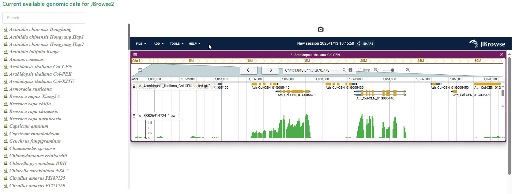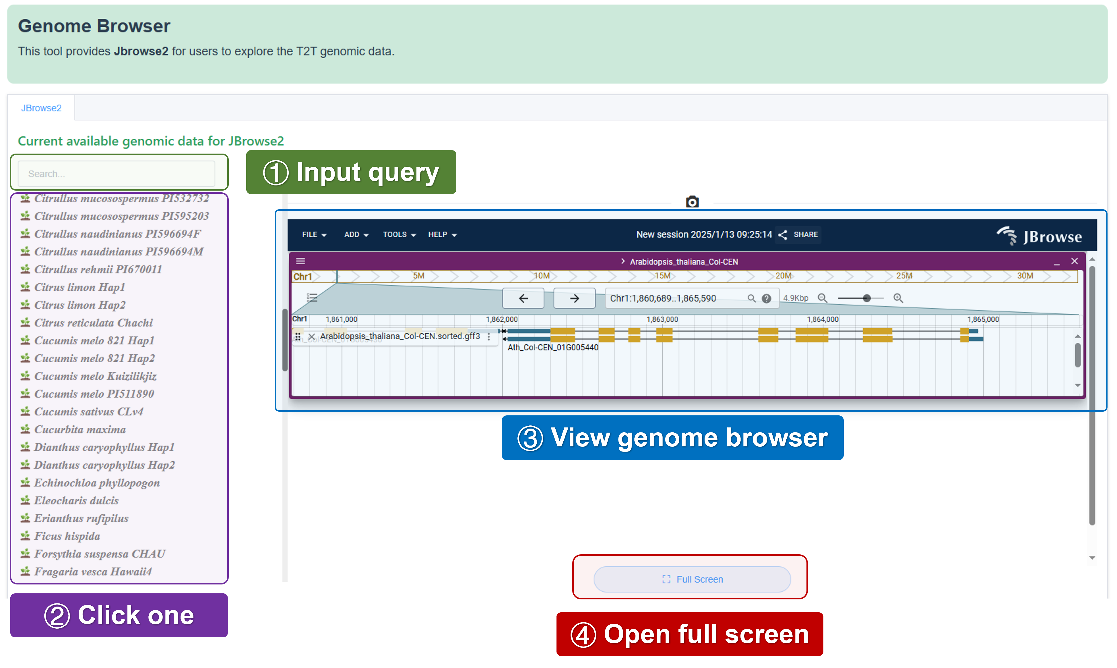 This module provides a genome browser for each species in T2T-Hub, where users can interactively browse genetic information including gene sequences, intron and exon arrangements, etc. This tool was developed based on JBrowse2.
