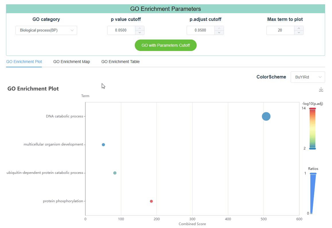 The GO enrichment tool provides a visualization of the GO enrichment results. Users can change the visualization by clicking on the corresponding button.