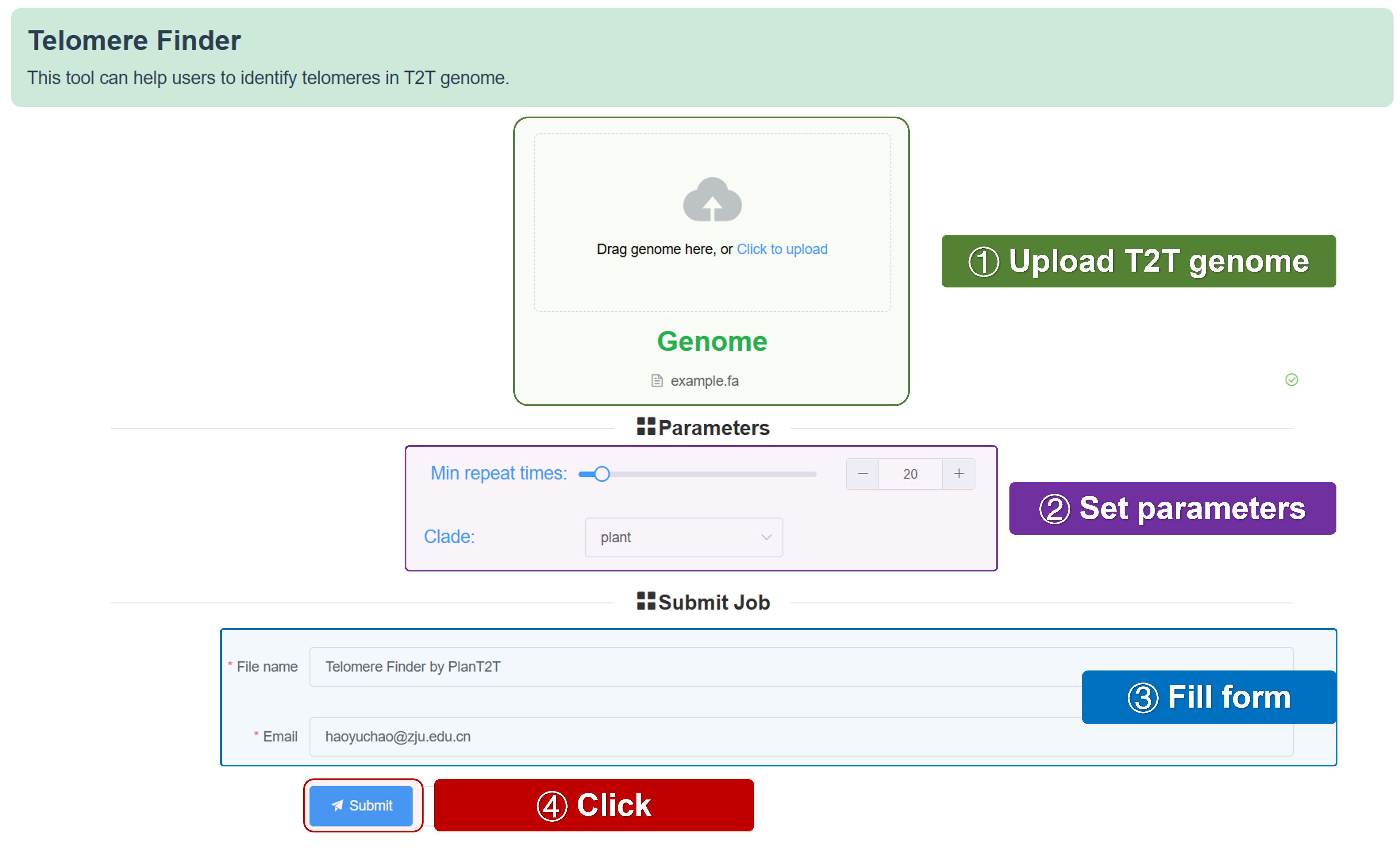 The Telomere Finder tool in T2T-Hub helps users identify the telomere regions in the genome. The telomere is the end of a chromosome, which is essential for maintaining the stability of the chromosome and preventing the loss of genetic information. The telomere is composed of a series of repetitive DNA sequences, such as CCCTAAA in plants. So, the telomere can be predicted by searching for the telomere sequence in the genome. Here, we screened the CCCTAAA sequence in the end of the chromosome for plant. If the repeat count is greater than 20, we consider it as a telomere.
