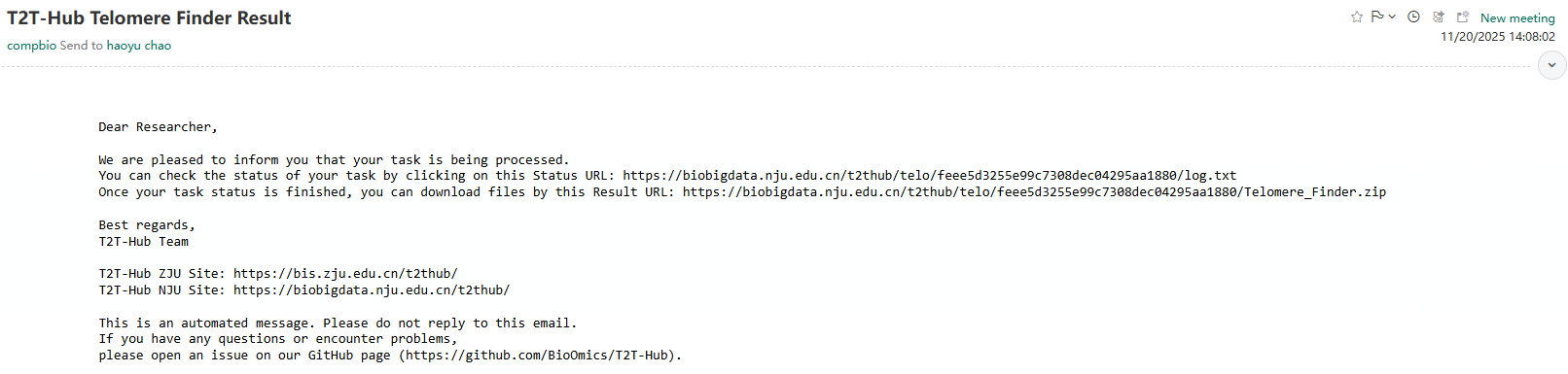 After the job is finished, you can cilck the Results URL to download the results. The results will be in a zip file, which contains the location of the telomere regions in the genome and graphical representation of the telomere regions.